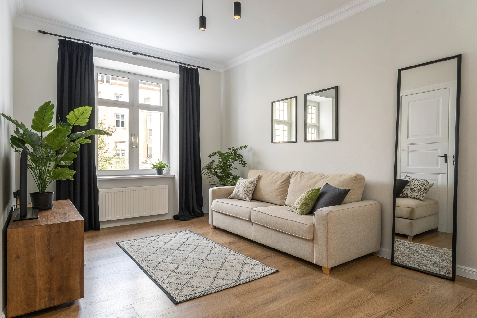 Правило первое: зеркало напротив окна удваивает свет. Это любимый прием дизайнеров, когда задача — «раздвинуть» стены и добавить солнечных бликов комнате. В типичной гостиной с одним окном размещают крупное зеркало ровно на противоположной стене — не обязательно во всю высоту, главное, чтобы оно ловило свет из окна и разбивало затененный угол. На фото видно, как авторы интерьера интегрировали лаконичное прямоугольное зеркало прямо напротив окна: светлый деревянный пол и бежевый диван усиливают игру отражений, черный карниз задает четкую рамку для композиции, а графитовая дверь добавляет глубины перспективы. Здесь хороший баланс — комната не становится «зеркальной коробкой», а ощущается легкой и свежей.